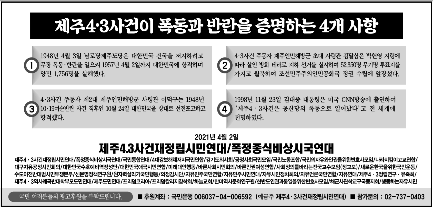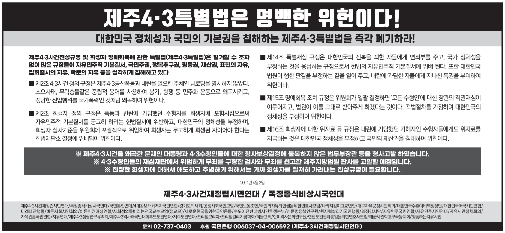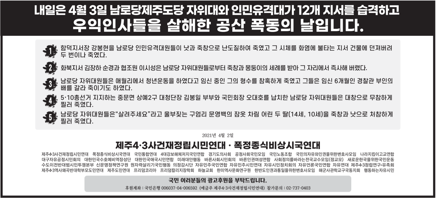 저희 제주4·3사건재정립시민연대 는 (이하 '회사'는) 고객님의 개인정보를 중요시하며, "정보통신망 이용촉진 및 정보보호"에 관한 법률을 준수하고 있습니다.