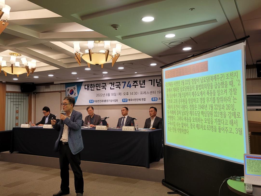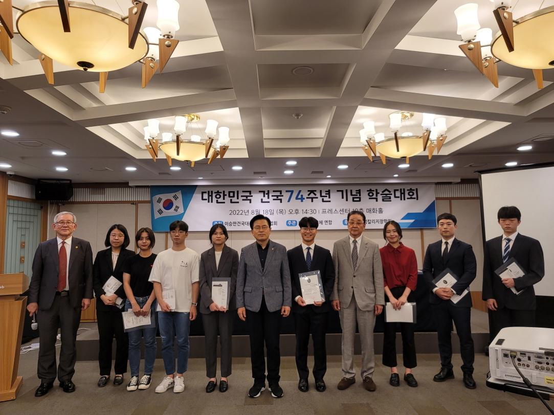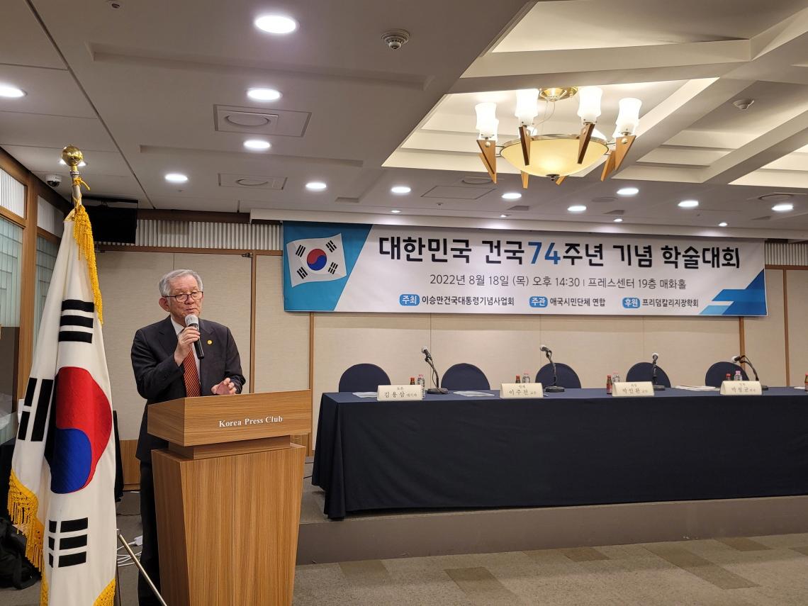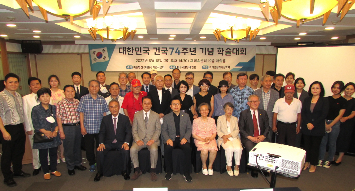 이승만건국대통령기념사업회는 애국시민단체 연합과 프리덤칼리지장학회의 후원으로 2022년 8월 18일 건국74주년 기념 학술대회를 프레스센터에서 개최하였다. 작년에 이어 두번째 열린 이번 학술대회에는 좌파의 끊임없는 공격대상이 되어온 박진경 대령과 서북청년단 두 테마를 선정하였다.