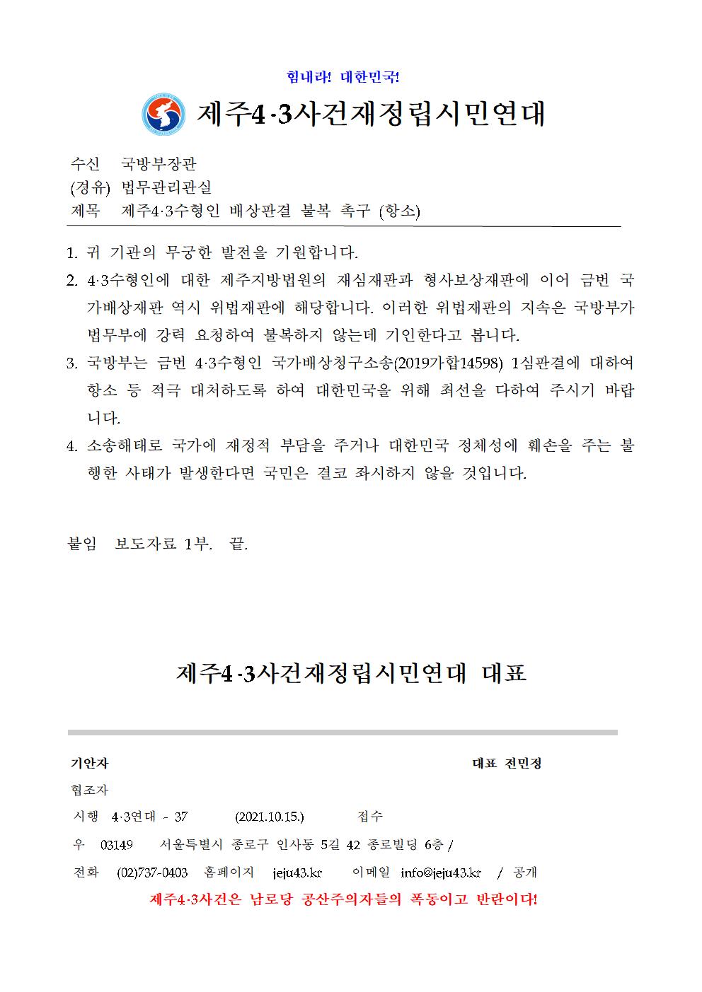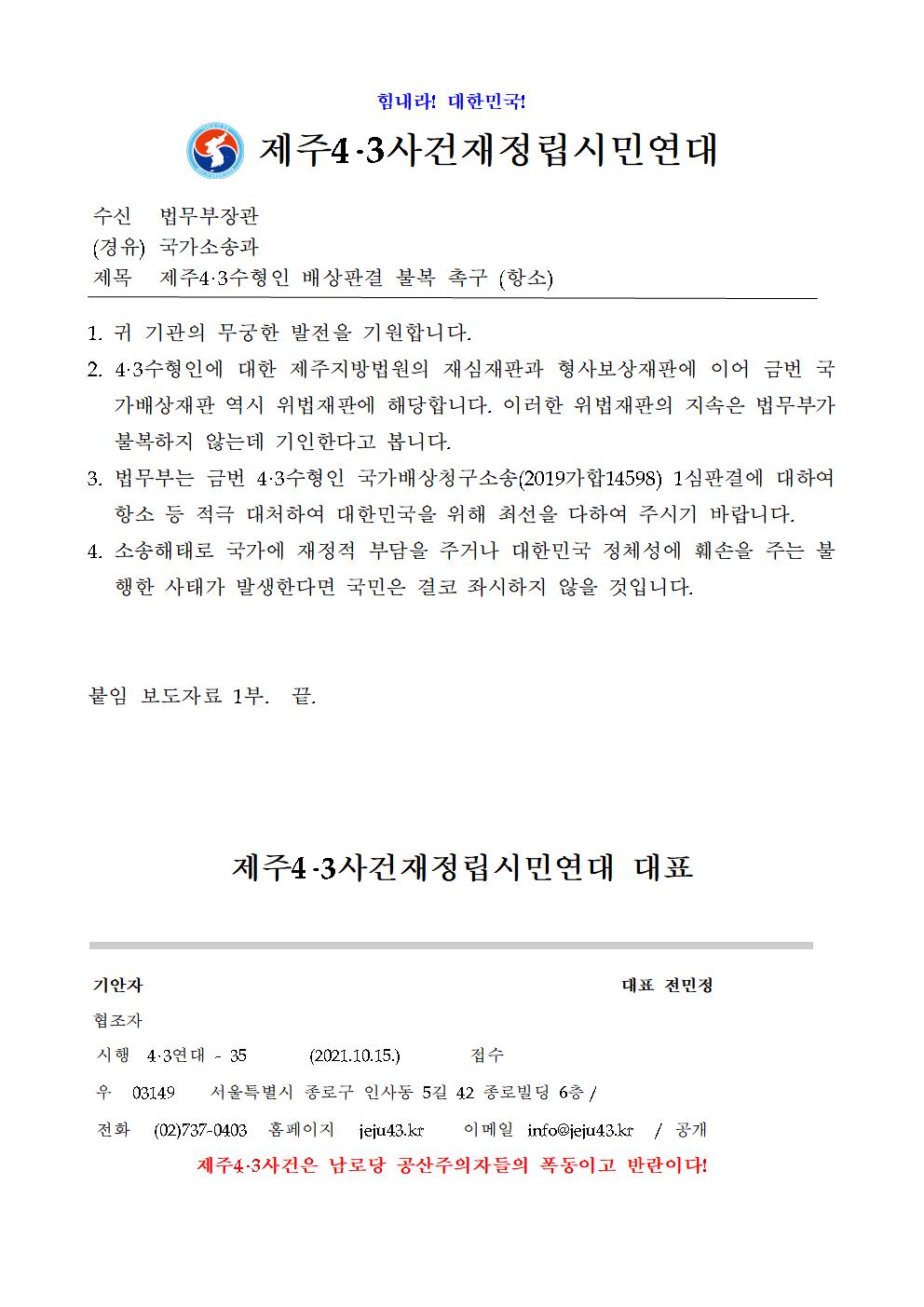 제주법원 4·3배상판결은 위법 - 법무부, 국방부, 제주지검 (21.10.15)